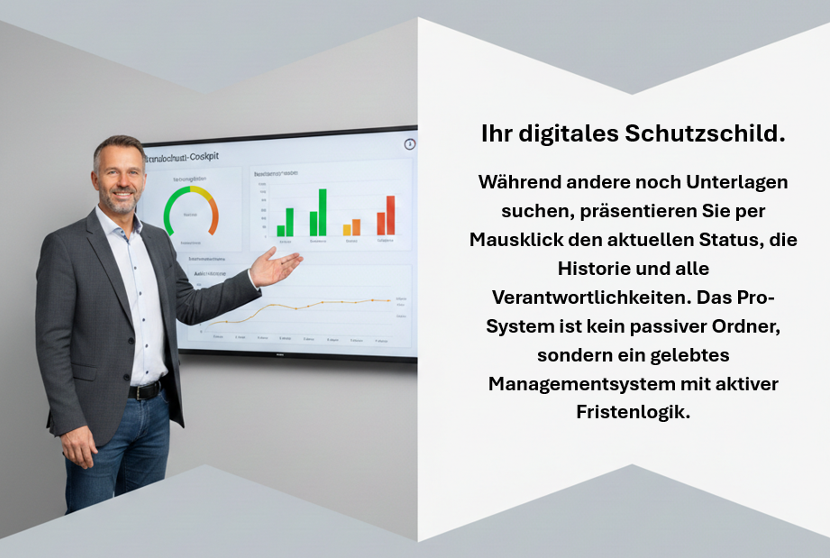 Schluss mit dem 5-Minuten-Stress bei unangekündigten Prüfungen. Mit unserem Brandschutz-System (Pro) reduzieren Sie Ihren Verwaltungsaufwand um 70 % und sichern Ihre Haftung lückenlos ab.
